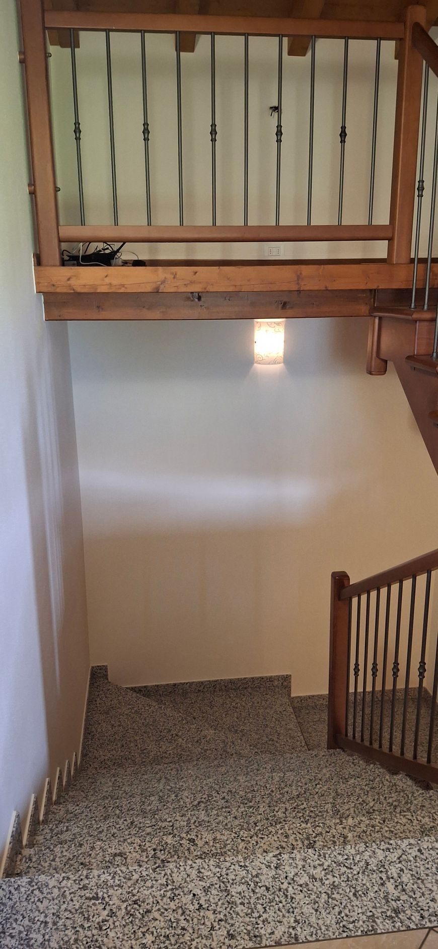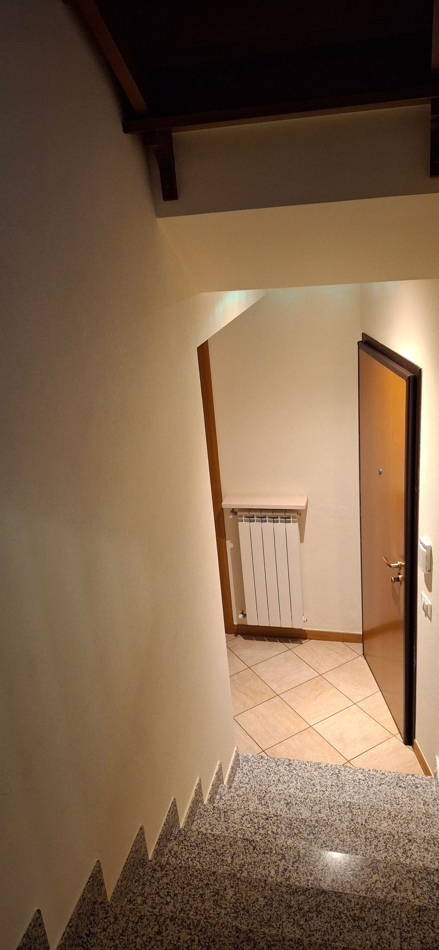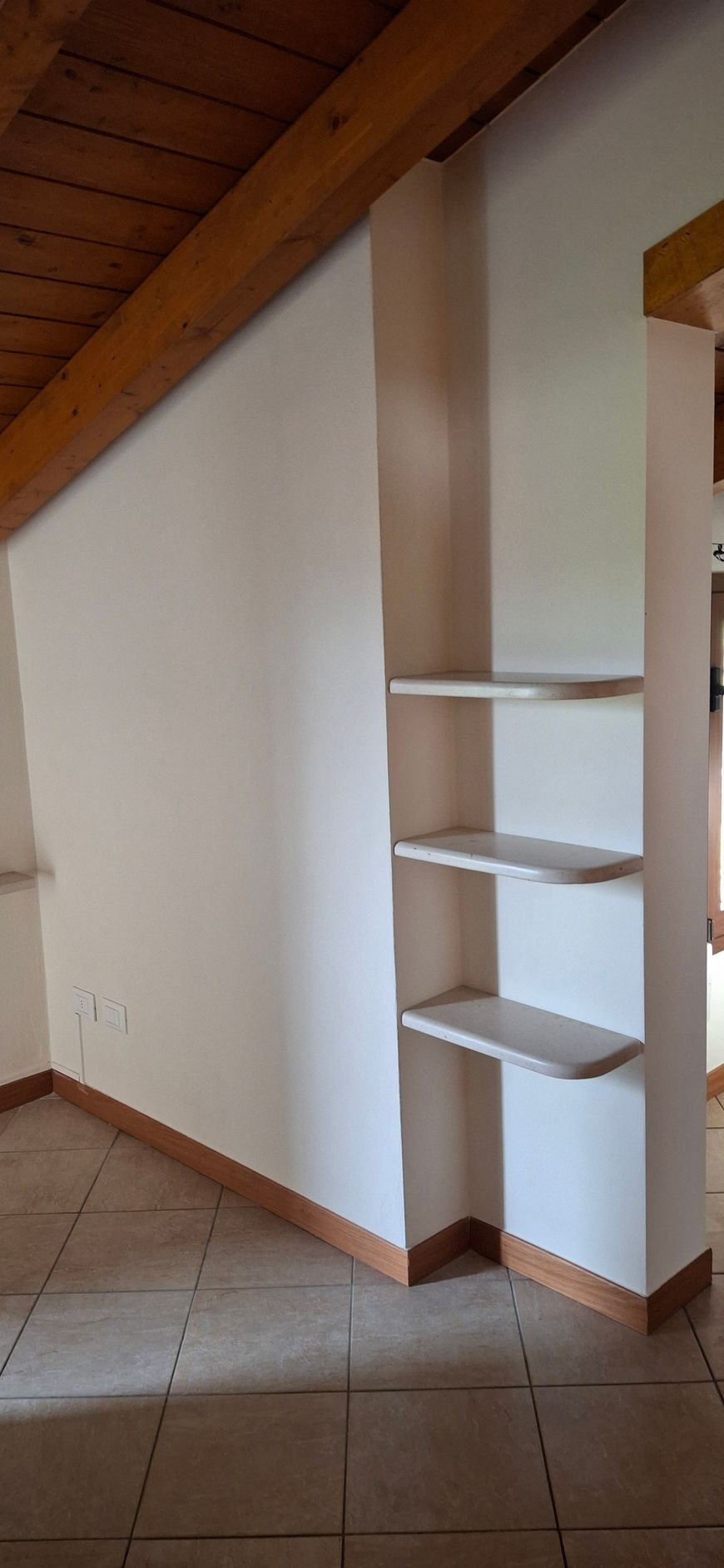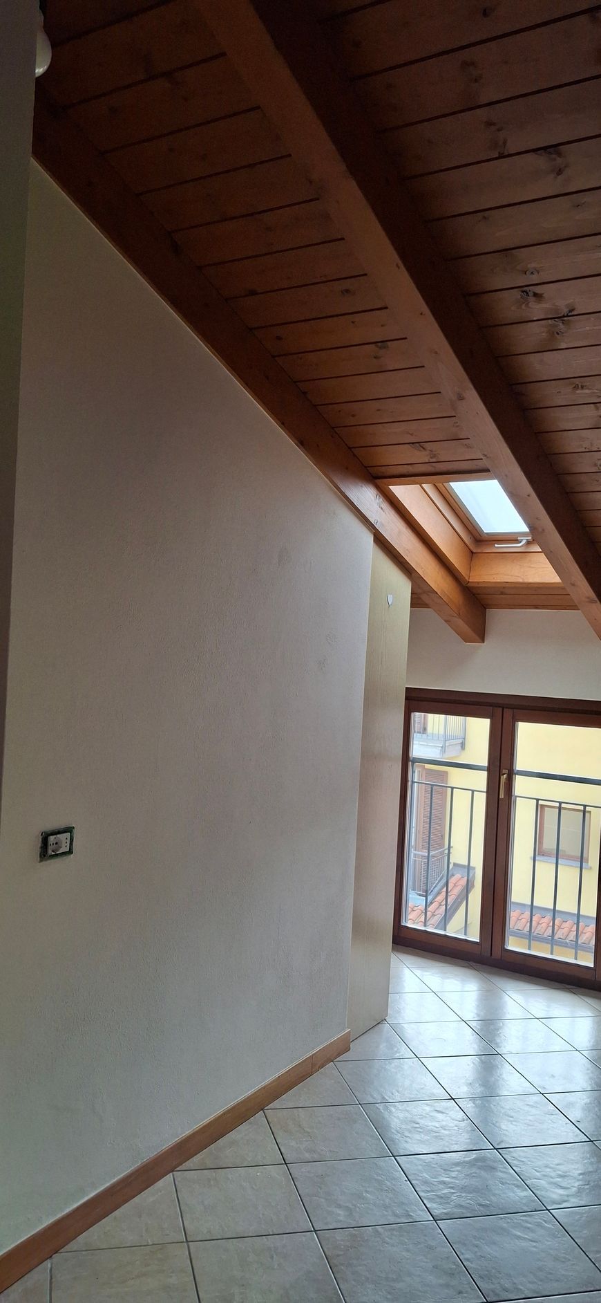 L'appartamento è composto da Piano Secondo Mansardato con travi in legno a vista Soggiorno/Cucina Bagno servito da doccia Balcone con vista sulle montagne _ Piano Primo con pavimento in parquet Camera Matrimoniale con balcone vista, Camera singola con ripostiglietto, bagno con vasca, di pertinenza all'immobile un box doppio di 31 mq.
